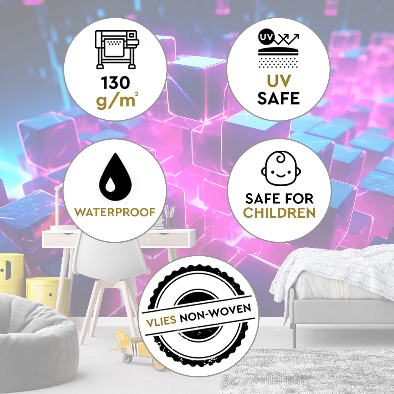 Gamyboje naudojami bekvapiai dažai yra visiškai saugūs aplinkai bei vaikams, atsparūs UV spinduliams ir vandeniui. Aukšta ryškių spalvų kokybė garantuoja, kad tapetų išvaizda nekis daugelį metų. Dėka naujosios UV gel dažų formulės užtikrinama didelė spalvų koncentracija ir net mažiausių detalių ryškumas bei vaizdo stabilumas.