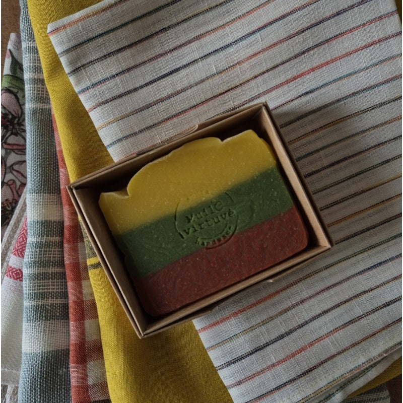 Visų rankų darbo muilų sudėtį sudaro aštuoni augaliniai ingriedientai - alyvuogių, kokosų, saldžiųjų migdolų, abrikosų kauliukų, ricinos, rapsų aliejai bei taukmedžio ir kakavos sviestas.