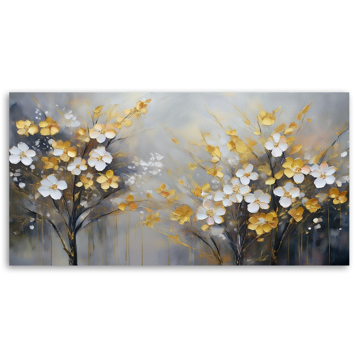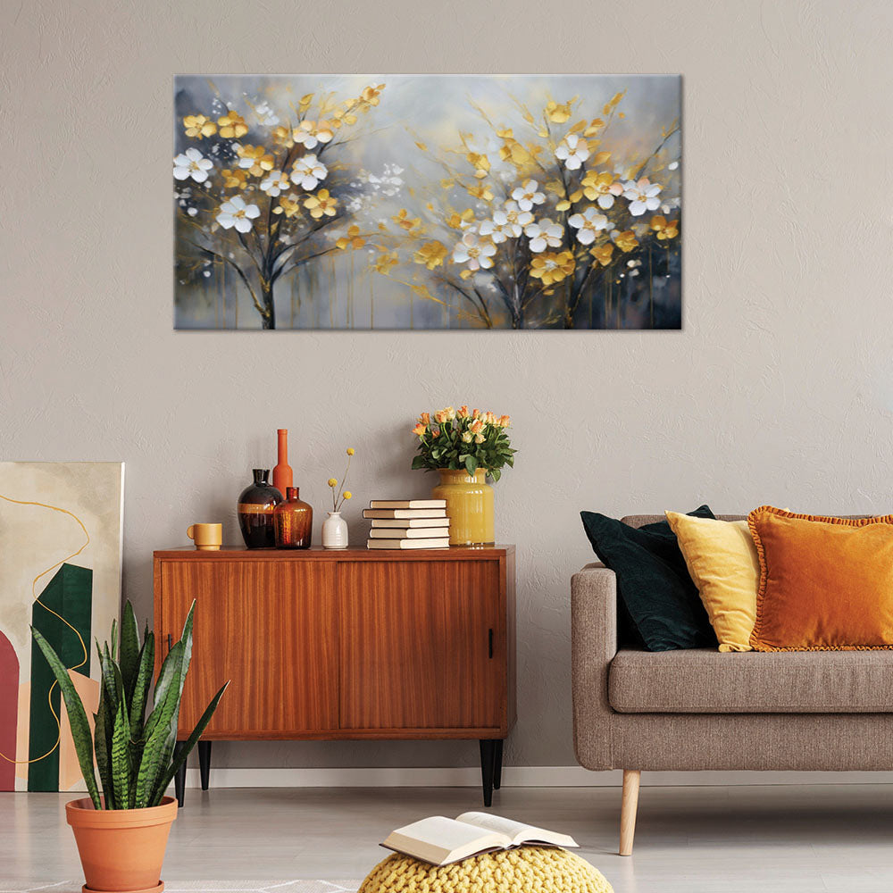 Painting on canvas, White and gold flowers on a tree