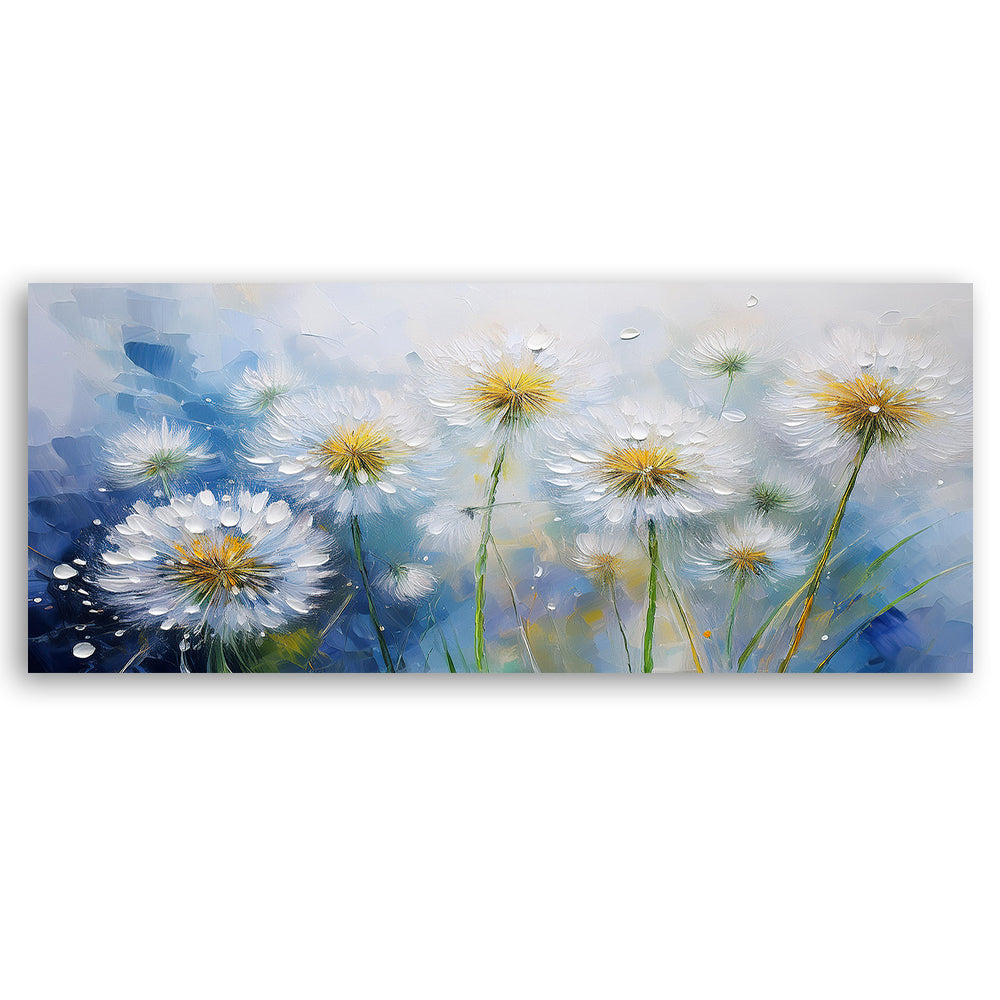 Painting on canvas,Dandelions fluff on a blue background