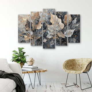 Five-part canvas painting, Gray gold luxurious leaves