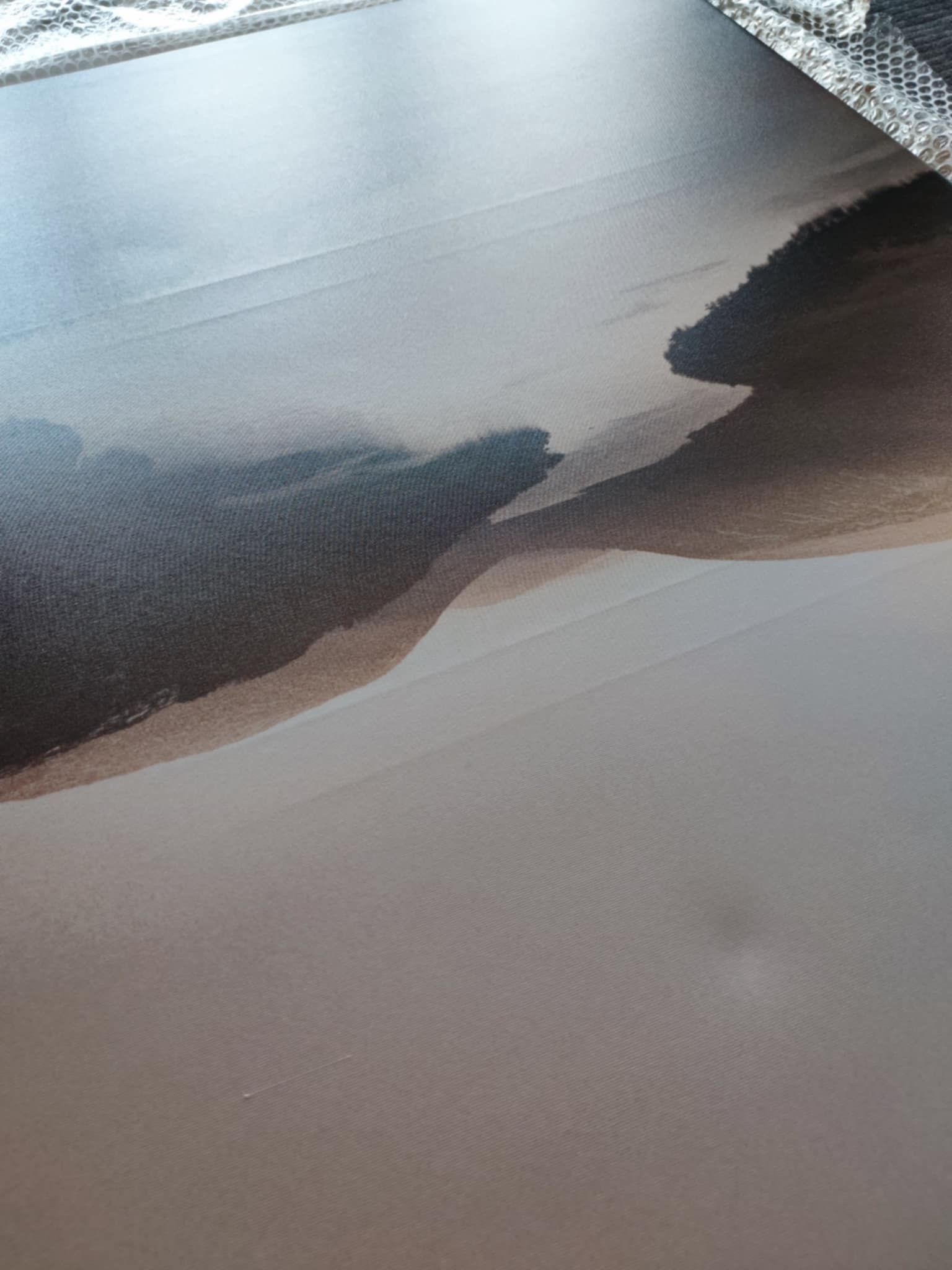 Transportavimo metu pažeistas paveikslas - į drobę nežymiai įsispaudęs rėmelis ir duobutė (žr. nuotraukas). Defektai matomi pakreipus prieš šviesą tam tikru kampu.