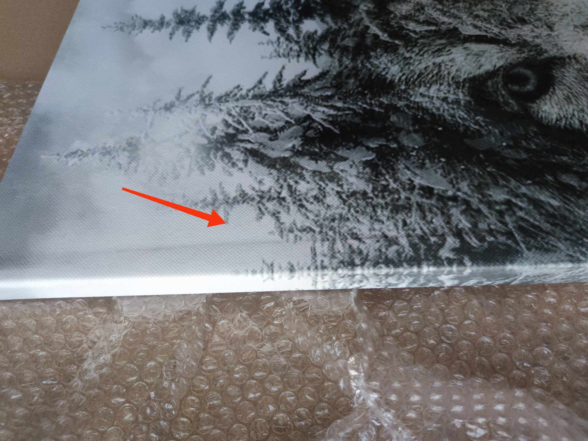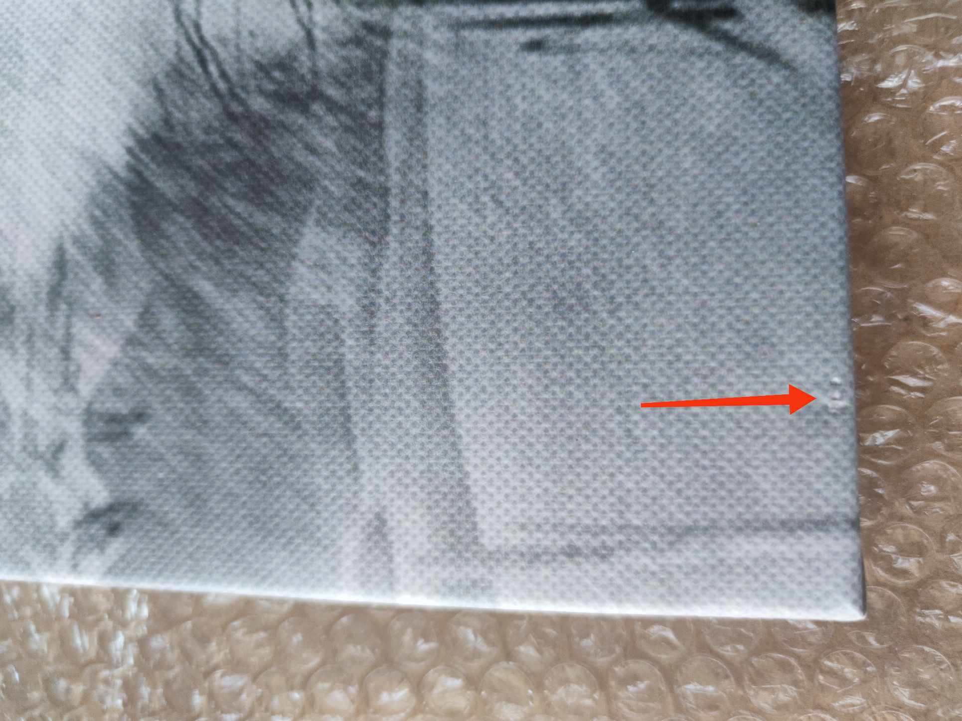 Transportavimo metu pažeistas paveikslas - į drobę įsispaudęs rėmelis ir metalinės skabės (žr. nuotraukas). Defektai matomi pakreipus prieš šviesą tam tikru kampu.